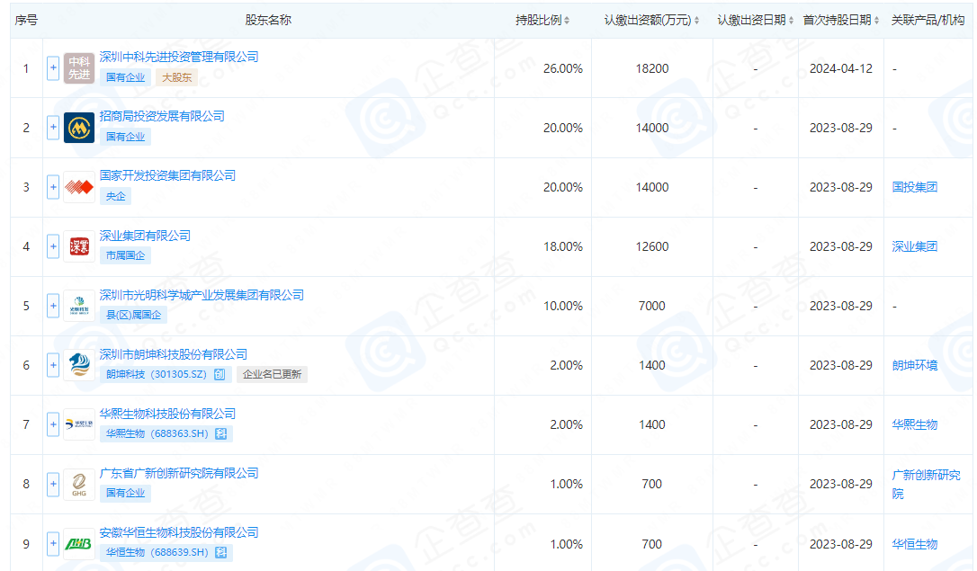 记者查询发现,中心通过组建深圳生物制造产业创新中心有限公司作为运营实体,注册资本70000万元,法定代表人为罗巍,具体由深圳中科先进投资管理有限公司持股26%、招商局投资发展有限公司持股20%、国家开发投资集团有限公司持股20%、深业集团有限公司持股18%、深圳市光明科学城产业发展集团有限公司持股10%等。